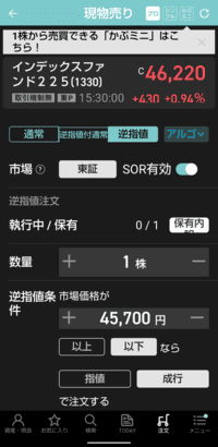 私の場合は「5%の利益だけは守りたい」と思ったので、45,500円で逆指値を入れました。